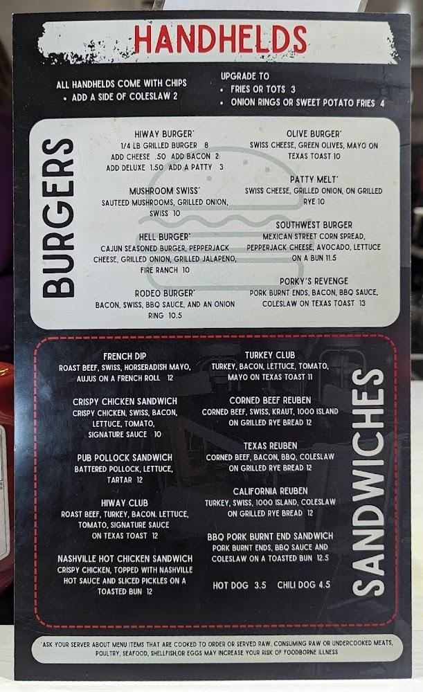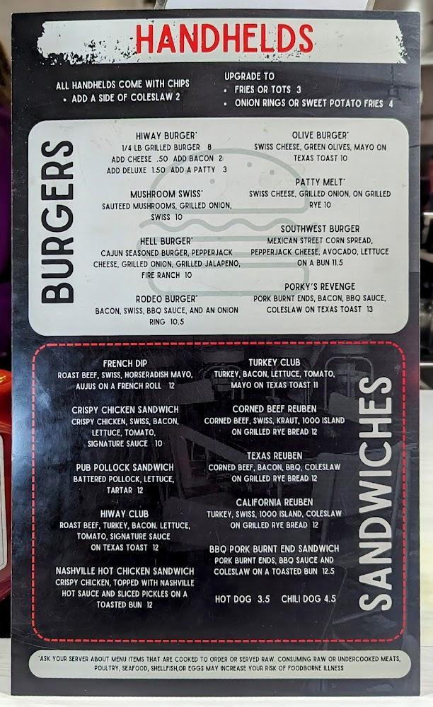 Hiway Inn's menu features a delightful mix of American bar food ranging from tasty burgers to tantalizing sandwiches. Signature burgers like the Hell Burger and the Olive Burger highlight the variety offered.